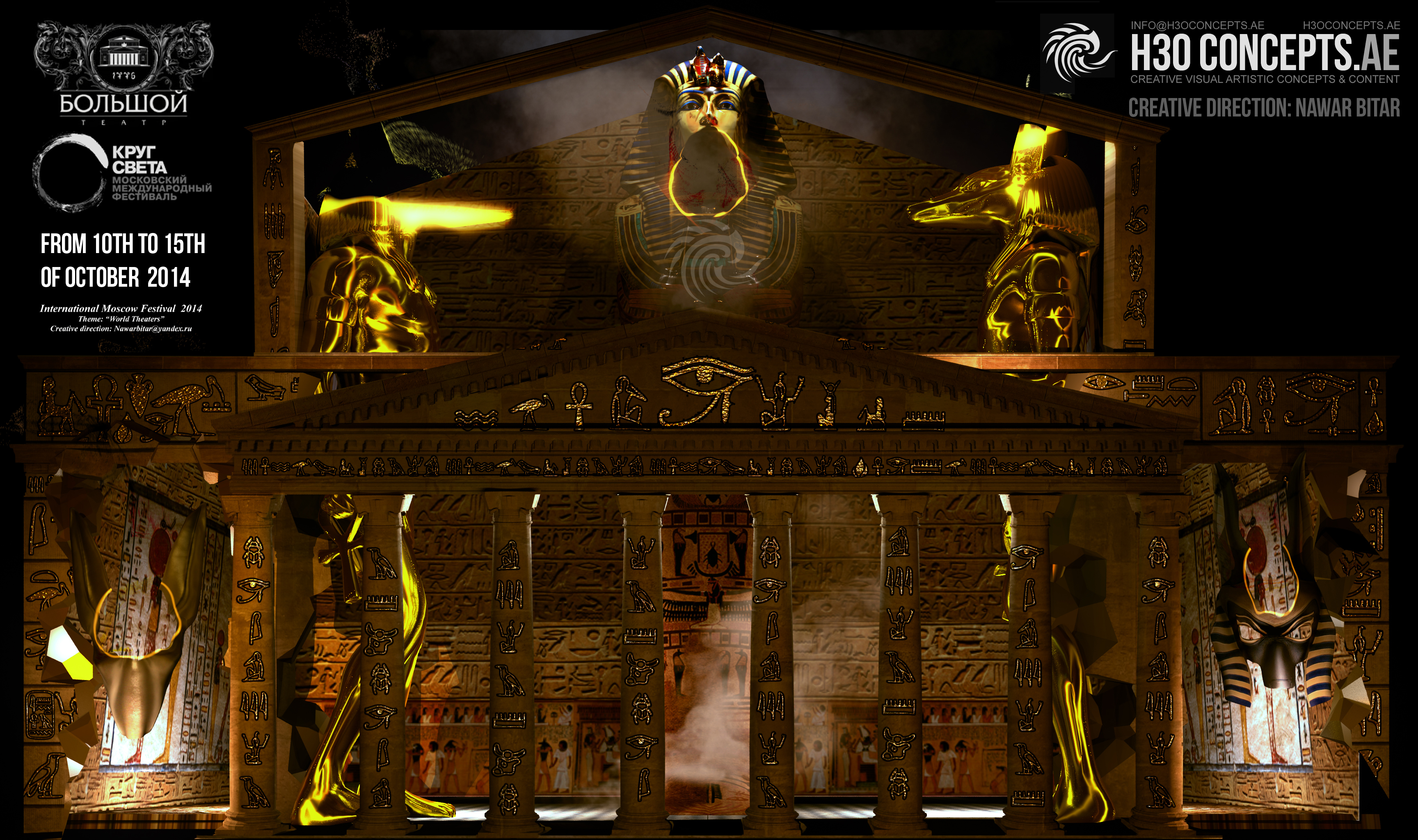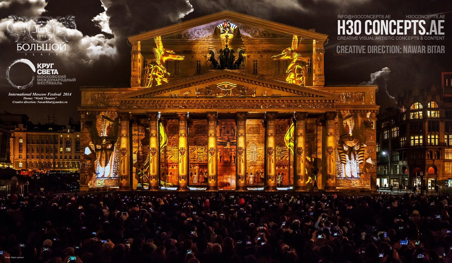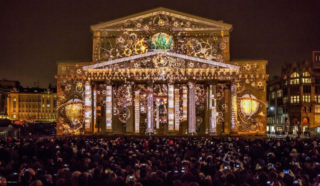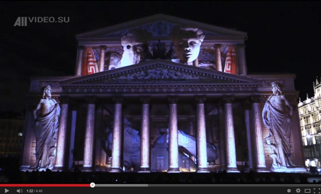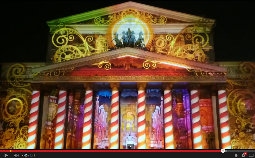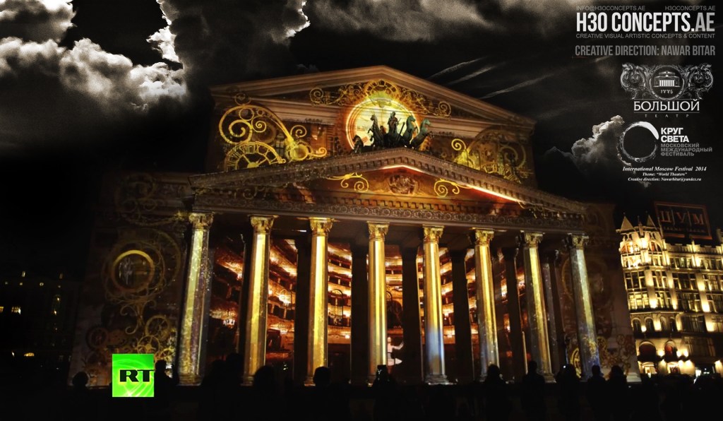 3D Mapping on the Boslhoi Theater facade, in the frame of the ” Circle of Light”, Moscow International Light Festival. 2014. http://www.lightfest.ru/en/. Theme: The World theaters. 4 main civilizations & theaters will be revisited and explored. Bringing forward contrasting theatrical specialties, milestones and breakthroughs of each Culture. It is a chronological cultural travel: ” During 4 minutes and a half, we will immerse people in different Spaces & Times.” Concept, Design & Artistic Direction: Nauar Bitar.http://www.lightfest.ru/en/