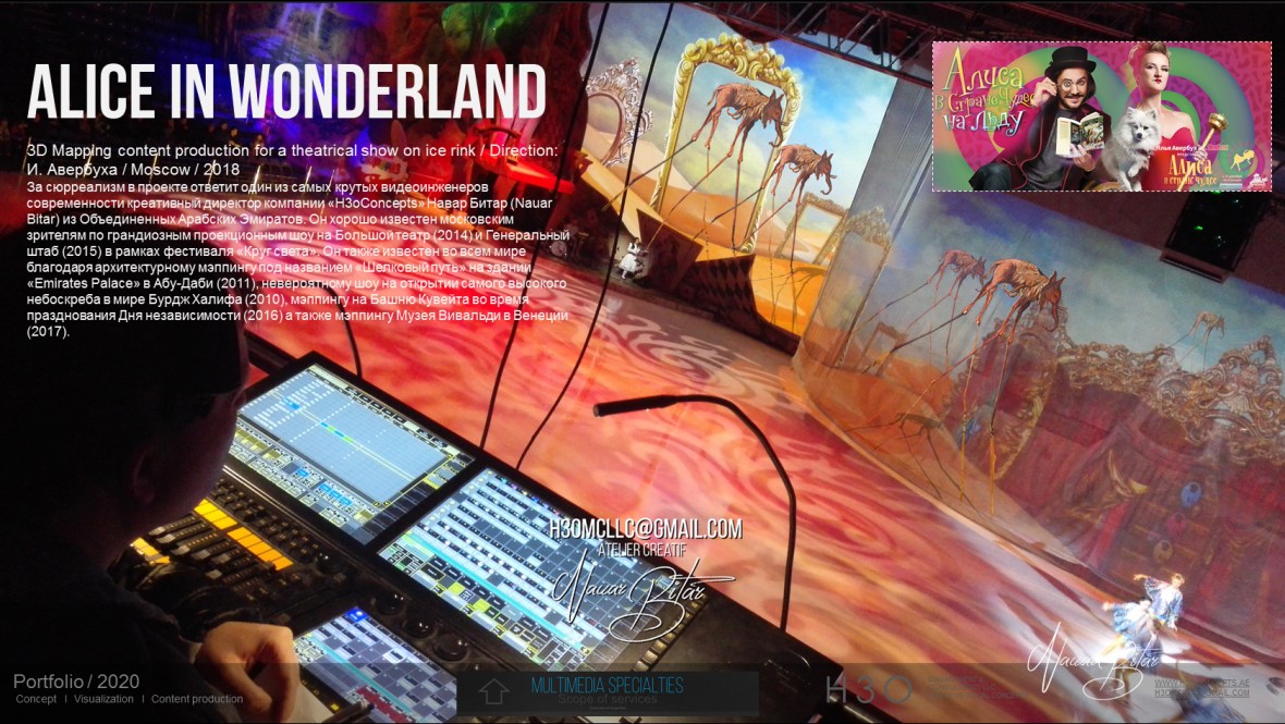 H 3 O – PORTFOLIO 2020 – Alica 01 August 4, 2020 • 1680 × 948 • Alice on Ice / Concept & design / 3D Mapping content production for a theatrical show / Direction: И. Авербуха / Moscow 2018