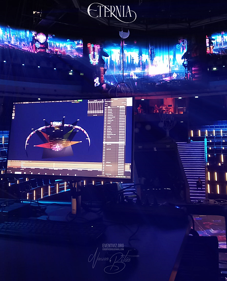 A custom video compositing software system was engineered to manage the massive content across 360° high-resolution LED screens converging into a central curved display. At the core, a cylindrical projection screen made of transparent fabric rolled down from the central truss system. The arena’s architecture also functioned as extended projection surfaces, creating a fully integrated immersive environment, offering interaction of acting performers with the floor surface. During 2 months of onsite supervision my aim was to integrate all of those different formats into one consistent and seamless “Tableau”.