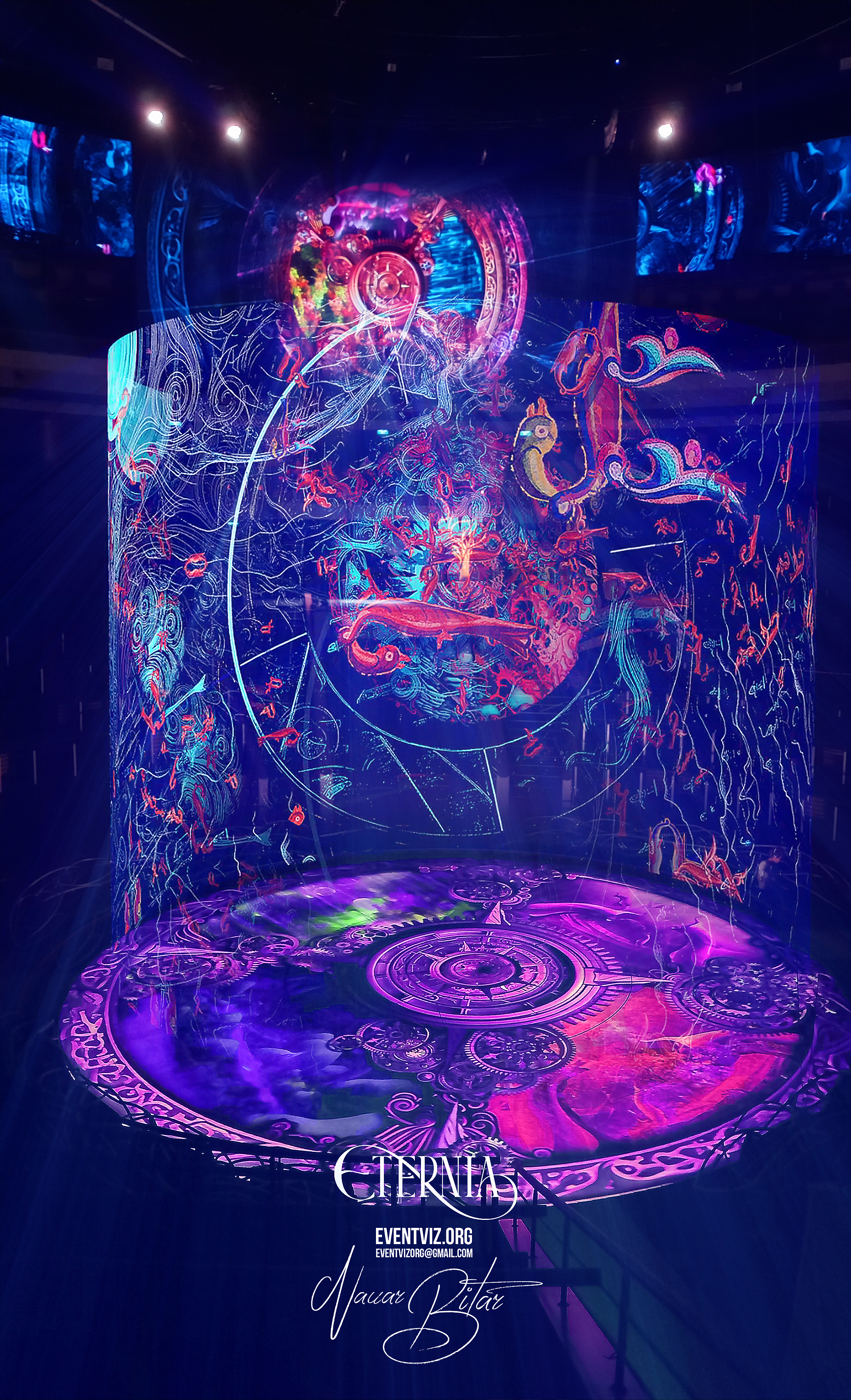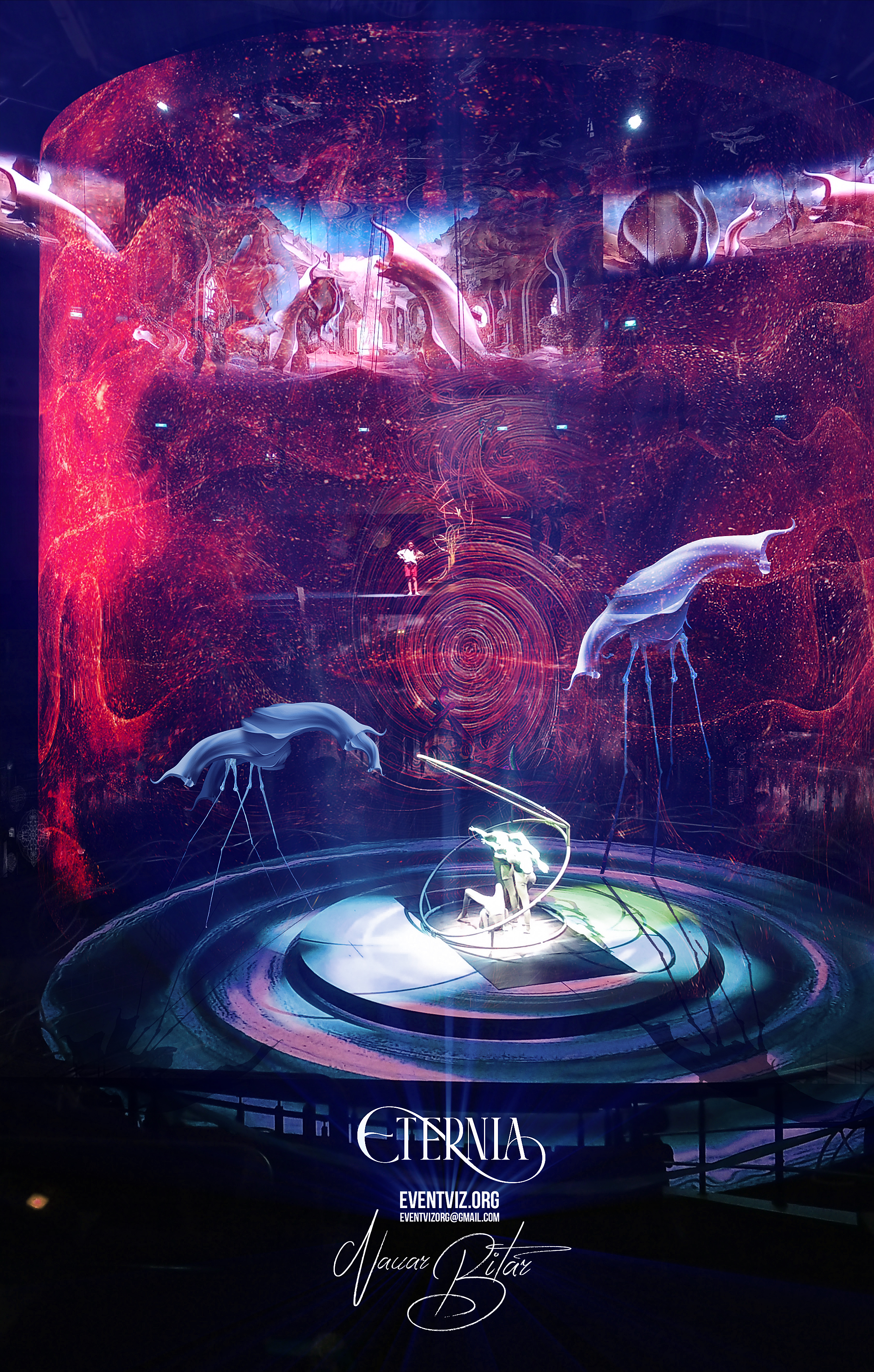 Being part of the creative team of Eternia Circus, I contributed to designing & producing immersive 360° visuals across a complex multi-surface system. The content was designed for a full 360° LED screen, a massive central transparent cylindrical screen, and the arena floor—synchronizing video, lighting, and scenography into a seamless panoramic experience that embraces the acrobats’ spontaneity while infusing a poetic atmosphere with subtle surrealism. ( Artistic interpretations )